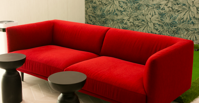 木目の温もりと柔らかな光が落ち着きをもたらし、鮮やかな赤いソファがアクセントとなって空間を引き締めます。